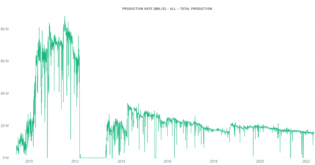 Frade é um campo maduro que produziu o primeiro óleo em 2009 e atingiu seu pico de produção em 2011, de acordo com a Figura 2. Este campo possui lâmina d’água que varia de 1000 a 1300m e atualmente conta com dez poços produtores. Tem um sistema de elevação artificial por gás lift e produz a partir de reservatórios areníticos através de poços horizontais.