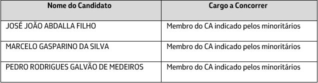 Os seguintes candidatos foram indicados pelas gestoras Absolute Gestão de Investimentos, Moat Capital Gestão de Recursos e Banco Clássico: