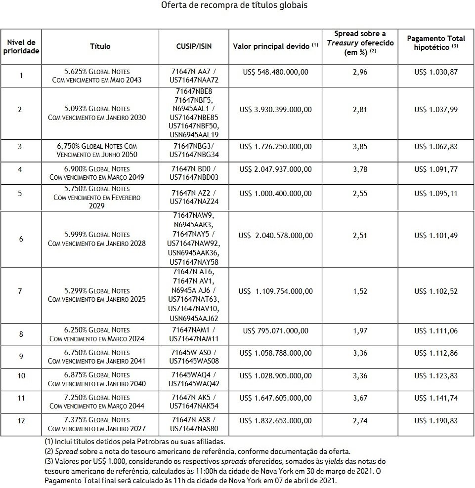 A oferta de recompra irá expirar às 17:00h, horário de Nova York, em 7 de abril de 2021 (Data de Expiração). Detentores de títulos que forem validamente entregues, não retirados e aceitos para recompra até a data de expiração serão elegíveis a receber o pagamento conforme termos e condições descritos na tabela acima, o que deve ocorrer no terceiro dia útil após a Data de Expiração (Data de Liquidação). O preço de recompra de cada título será calculado a partir do spread sobre a taxa das notas do tesouro americano (Treasury) de referência de cada título, de acordo com os valores elencados na tabela. Adicionalmente, os detentores de títulos que entregarem seus títulos também receberão juros capitalizados até a Data de Liquidação.
