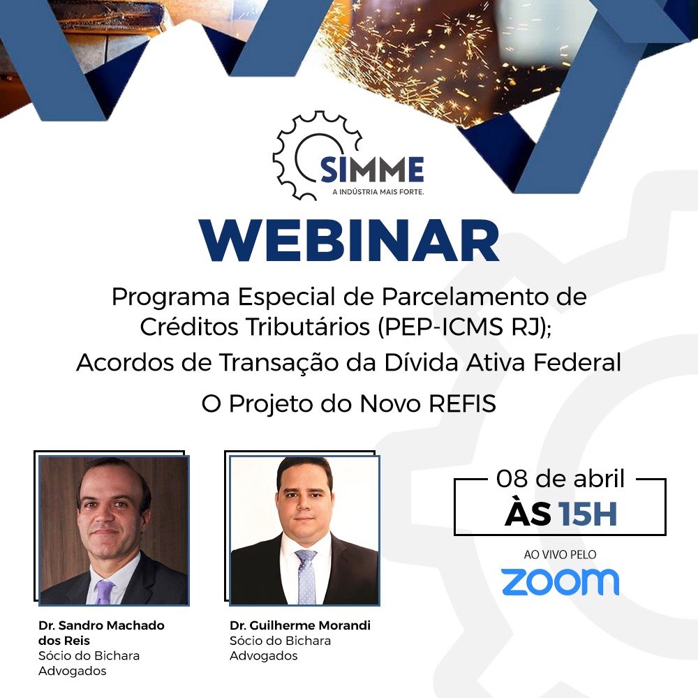 O SIMME, sindicato que reúne as indústrias do setor metalmecânico da cidade do Rio de Janeiro, convidou os advogados Sandro Machado dos Reis e Guilherme Morandi, do Bichara Advogados, para um Webinar sobre os “Programas Especiais de Parcelamento”, no dia 08 de abril, às 15h.