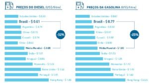 Para o diesel, em uma amostragem de 166 países, o preço final no Brasil está 28% inferior à média global e ocupa a 43ª posição do ranking, ou seja, inferior a 123 países.