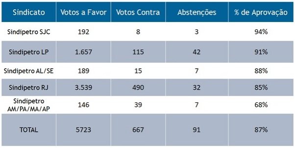 Os Sindipetros Rio de Janeiro, Litoral Paulista, São José dos Campos, Alagoas/Sergipe e Pará/Amazonas/Maranhão/Amapá – assinaram o Acordo Coletivo de Trabalho 2020/2022 na quarta-feira, dia 14/10. Assim, todas as bases sindicais estão abrangidas pelos termos do novo ACT. Nesta segunda rodada de assembleias, a proposta foi aprovada por ampla maioria nessas bases, conforme quadro abaixo.
