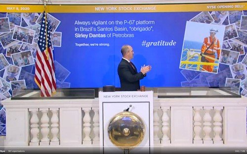 A Petrobras foi reconhecida, pela NYSE, a bolsa de Nova York, como uma das 40 empresas do mundo que estão atuando com segurança durante a crise do novo coronavírus. Na cerimônia de abertura do mercado americano de hoje, tradicionalmente marcada pelo toque do sino da bolsa, a companhia foi representada pela projeção na tela da foto de um de seus colaboradores, a bordo da plataforma P-67, em um campo do pré-sal.
