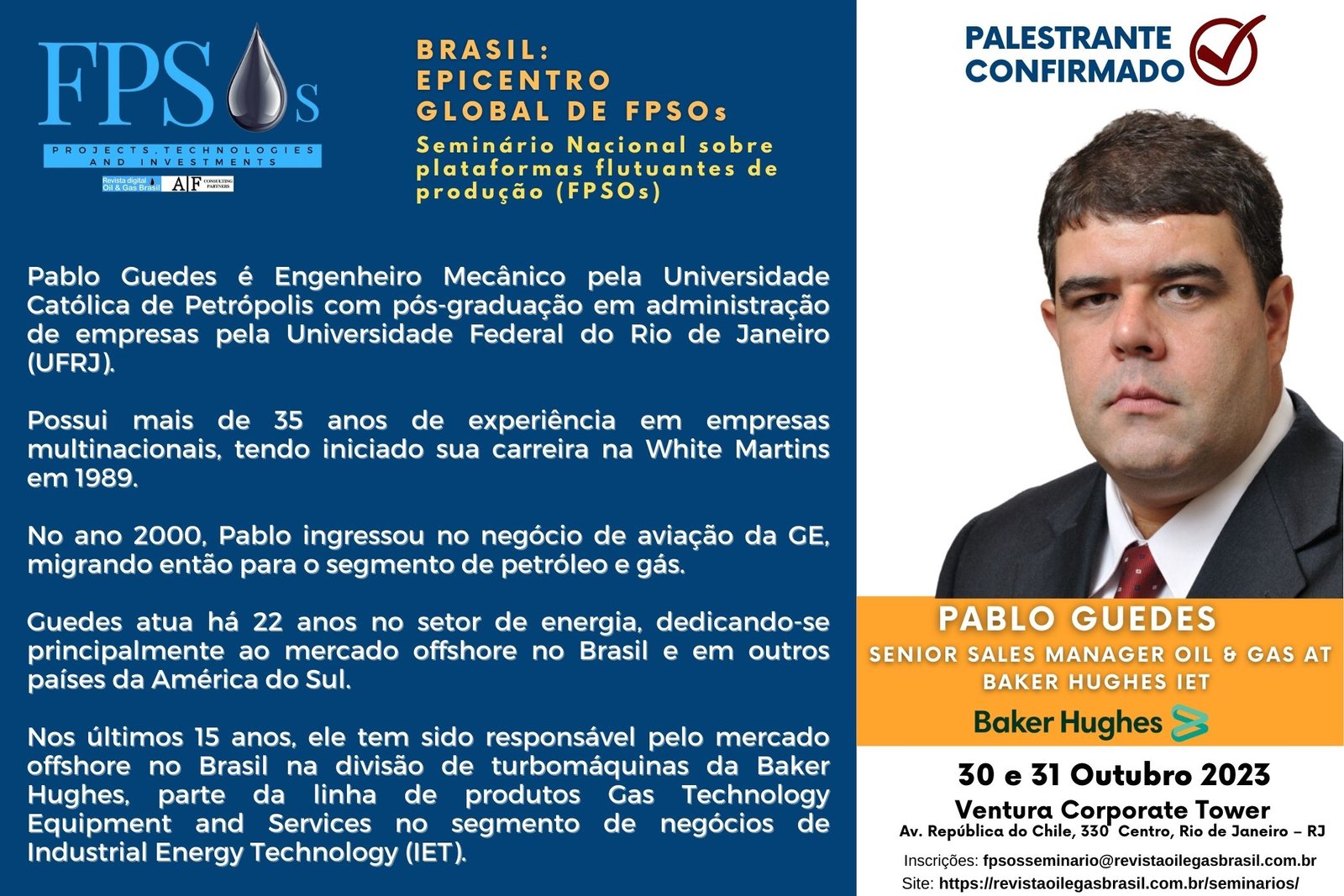 SEMINÁRIO: BRASIL – EPICENTRO GLOBAL DE FPSOs – 1º Simpósio Nacional sobre plataformas flutuantes de produção (FPSOs). O evento organizado pela Revista digital Oil & Gas Brasil e apoio da AIF Consulting Partners será realizado na vibrante cidade do Rio de Janeiro. Nos dias 30 e 31 de outubro de 2023 na Ventura Corporate Tower, no Rio de Janeiro!