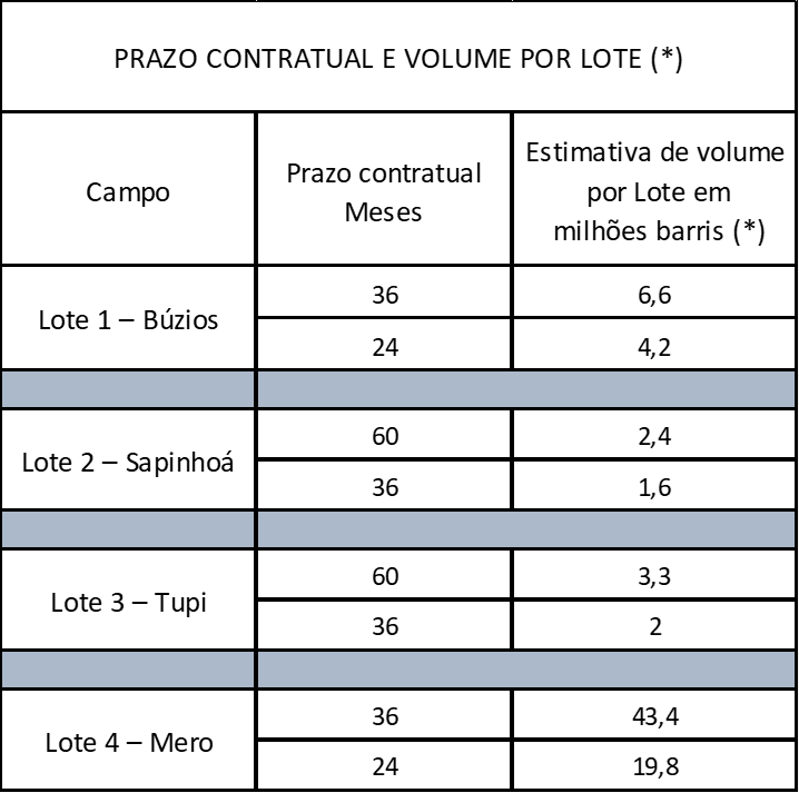 As cargas serão leiloadas em quatro lotes, um para cada campo produtor e em contratos de 24, 36 ou 60 meses dependendo do lote. A maior carga a ser comercializada é da Área de Desenvolvimento de Mero. O comprador poderá adquirir um lote de 43,4 milhões de barris em 36 meses ou de 19,8 milhões em 24 meses. Na sequência, estão os lotes do excedente da Cessão Onerosa de Búzios, de Tupi e Sapinhoá, que serão oferecidos em 60 e 36 meses. É importante frisar que os volumes são estimativas da futura parcela de petróleo da União nestes campos, que contemplam as incertezas inerentes ao processo. Isso significa que, ao arrematar um lote, o comprador terá disponível toda a carga nomeada no período, ainda que seja maior ou menor ao volume estipulado no edital.