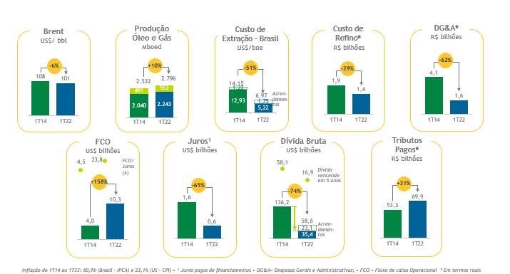 A geração de caixa operacional no primeiro trimestre de 2022 medida pelo EBITDA ajustado recorrente foi de R$ 78,2 bilhões e o fluxo de caixa livre foi de R$ 40,5 bilhões. Estes indicadores estão em linha com a média do resultado dos pares da indústria de petróleo e gás natural.